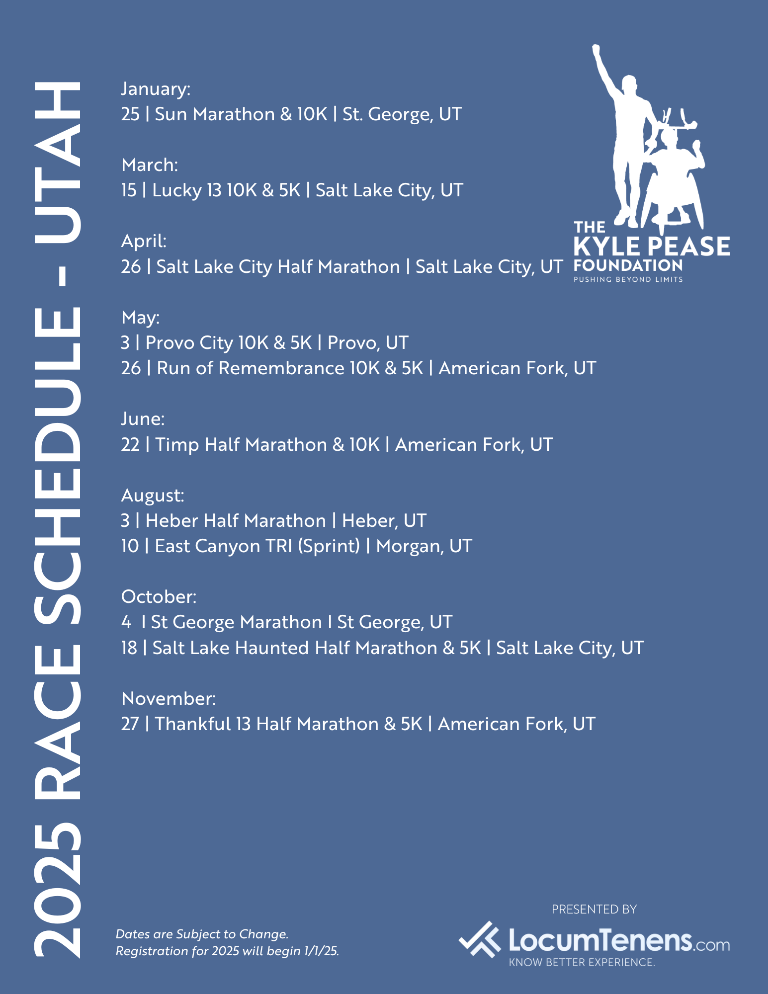 In 2017, The Kyle Pease Foundation expanded its operations out west to the state of Utah. Through the support of local leaders, we have been able to participate in numerous races and events annually across the entire state.